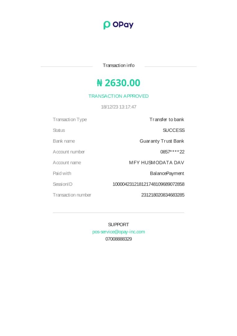 I made a transfer from my opay to credit my husmodata wallet via the GTBank account but it's been a long time and my husmodata wallet has not been credited.